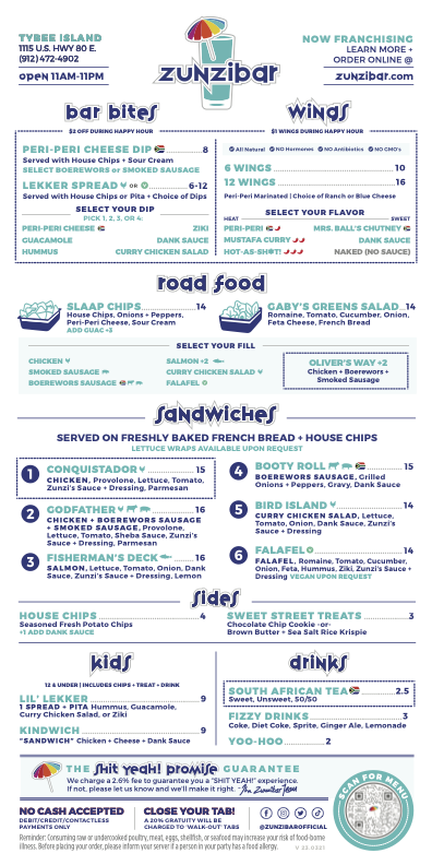 Zunzibar, located on Tybee Island, GA, offers a vibrant tropical escape with a unique menu inspired by South African flavors. This lively eatery features an open-air patio perfect for enjoying refreshing cocktails like the Coco-MO and Banana Hammock. Guests rave about the Bird Island Sandwich, flavorful wings tossed in unique sauces, and homemade chips with delightful dips. The attentive staff, including knowledgeable servers, create a welcoming atmosphere that enhances the dining experience. With its lively ambiance, great food, and exceptional service, Zunzibar is truly a must-visit for anyone seeking a taste of tropical paradise.